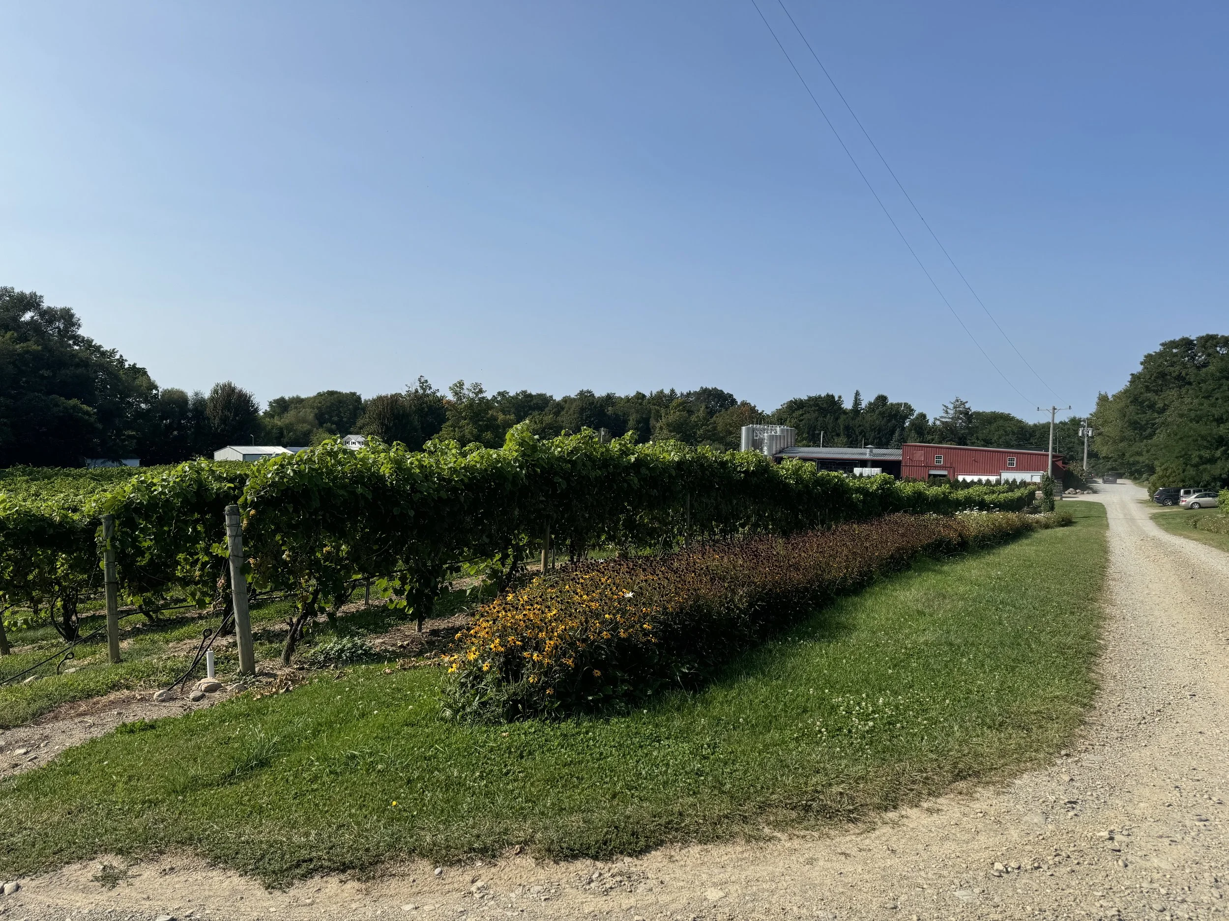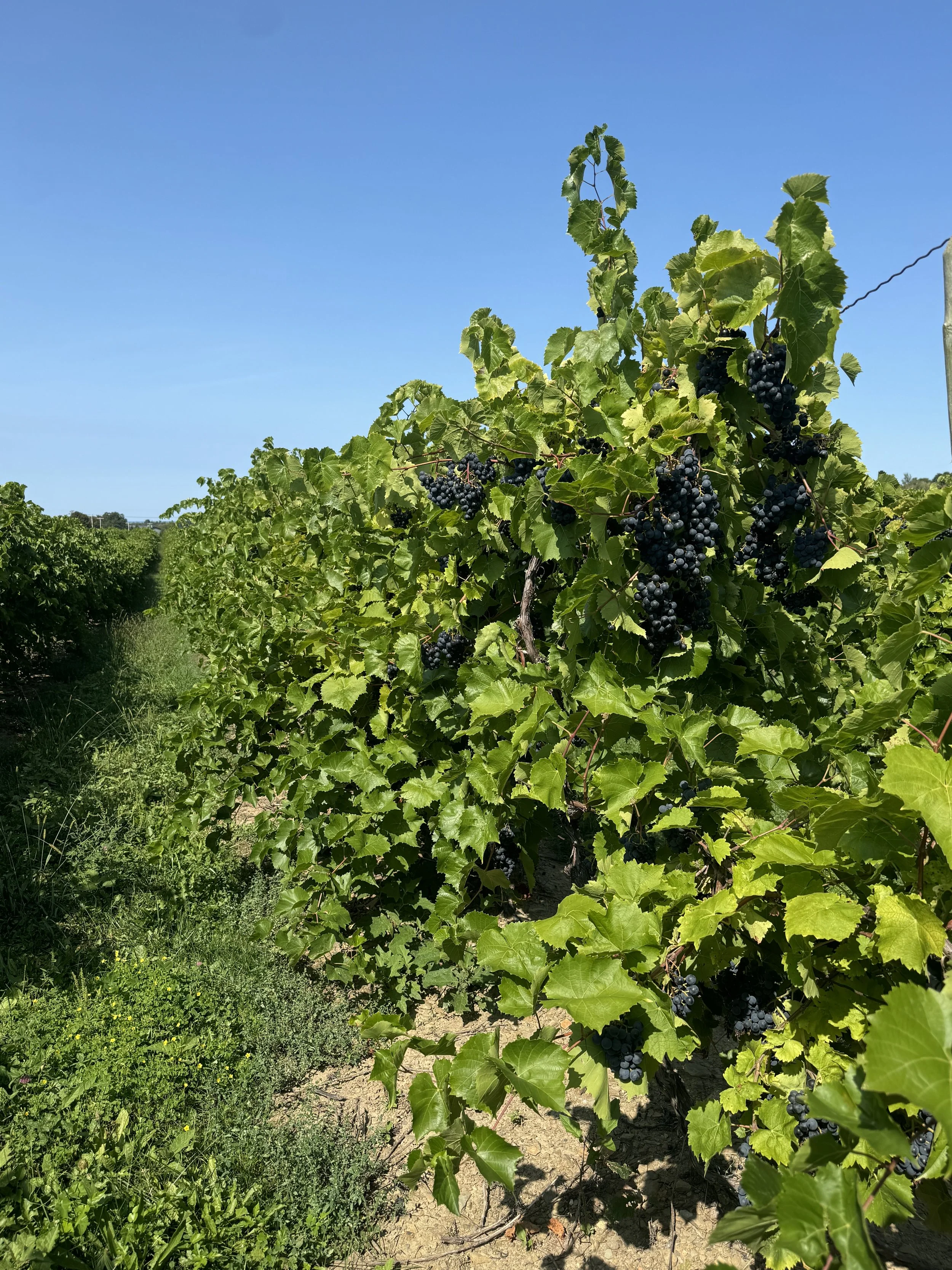 We use French-American hybrid grape varietals — Chancellor, Foch, and Vidal Blanc — that are well suited to this climate. That means fewer sprays, healthier vines, and clean fruit that doesn’t need fixing later. These grapes also allow us to make a wine that’s naturally bright, low in alcohol, and refreshing instead of heavy.